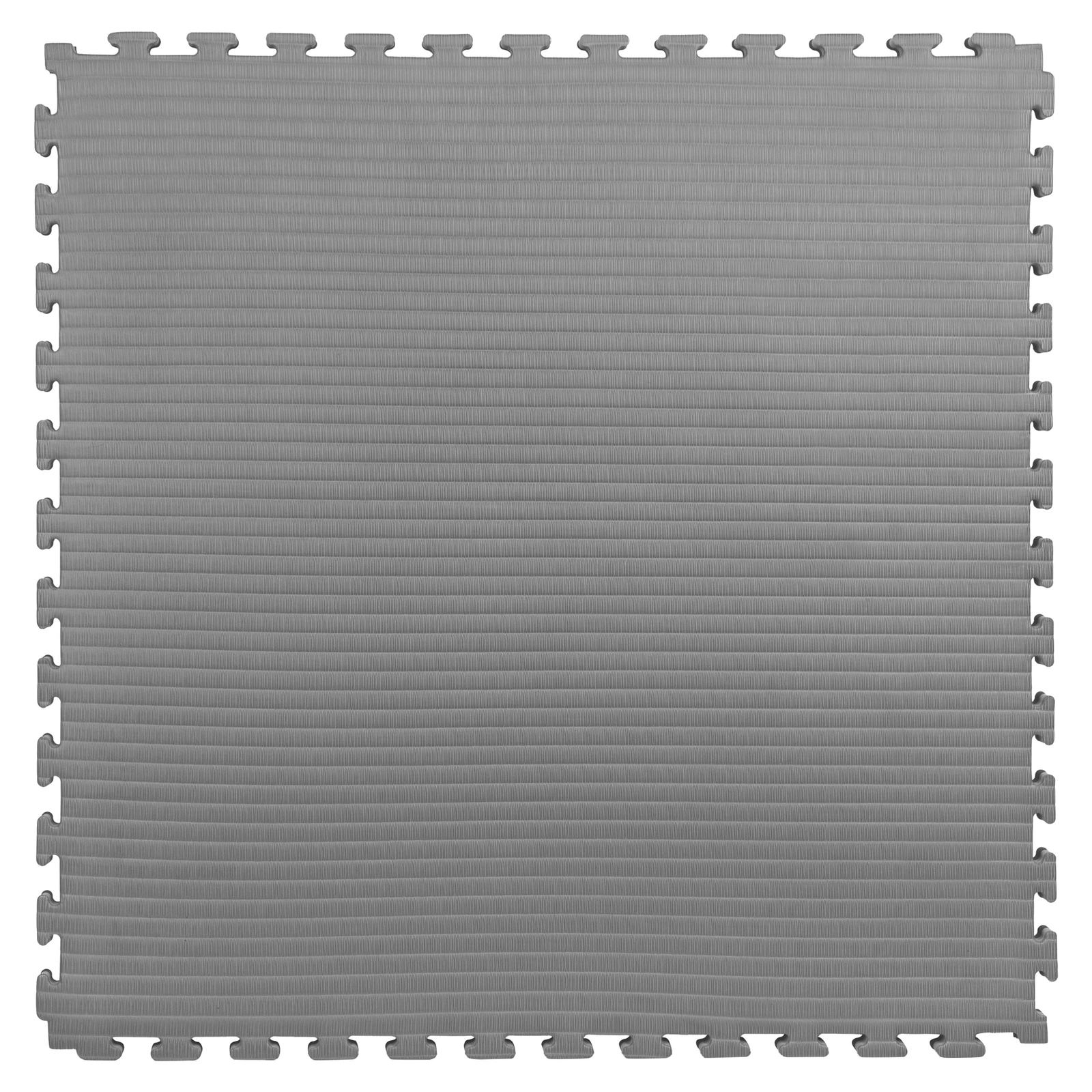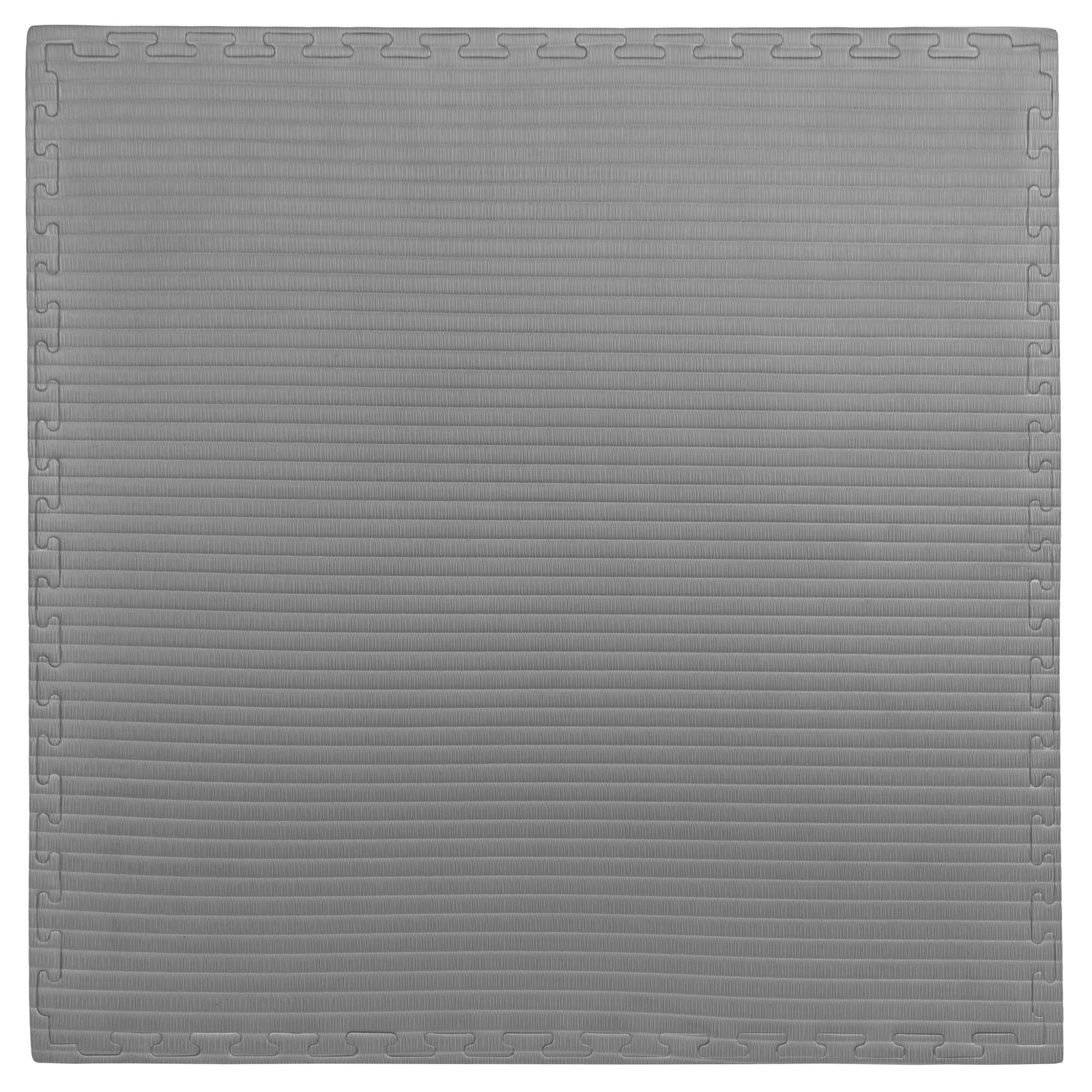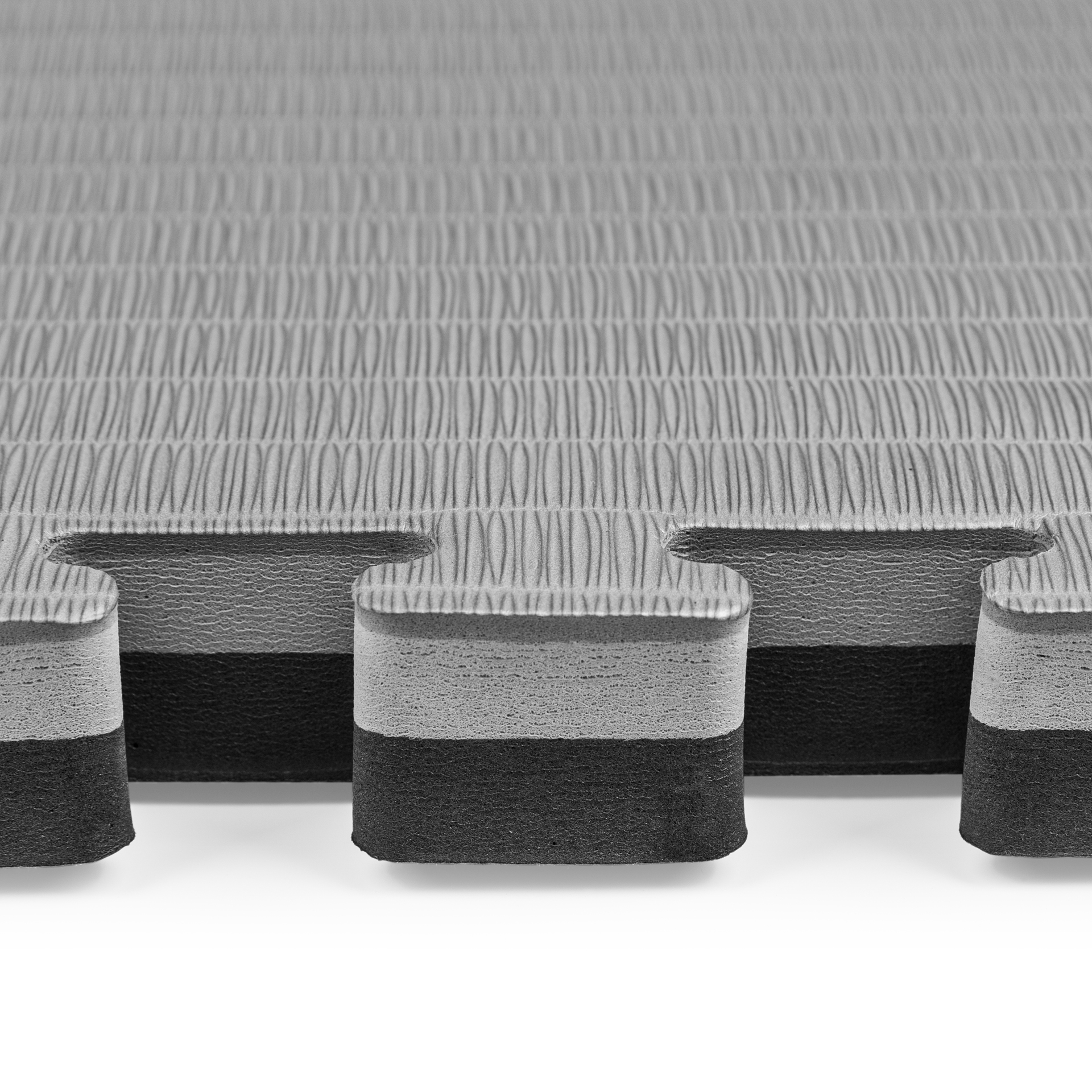 Zdjęcie po prawej stronie przedstawia 4 maty puzzle złączone razem. Oferowane Państwu maty puzzle są dwukolorowe, po jednej stronie są szare a po drugiej czarne co pozwala samemu wybrać która strona powinna być widoczna od góry.